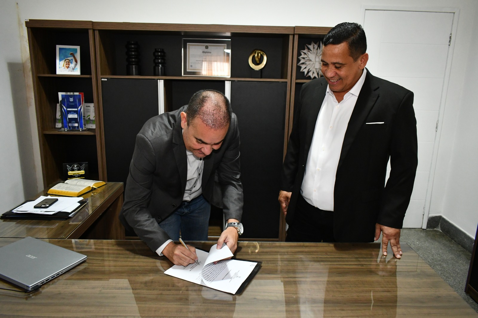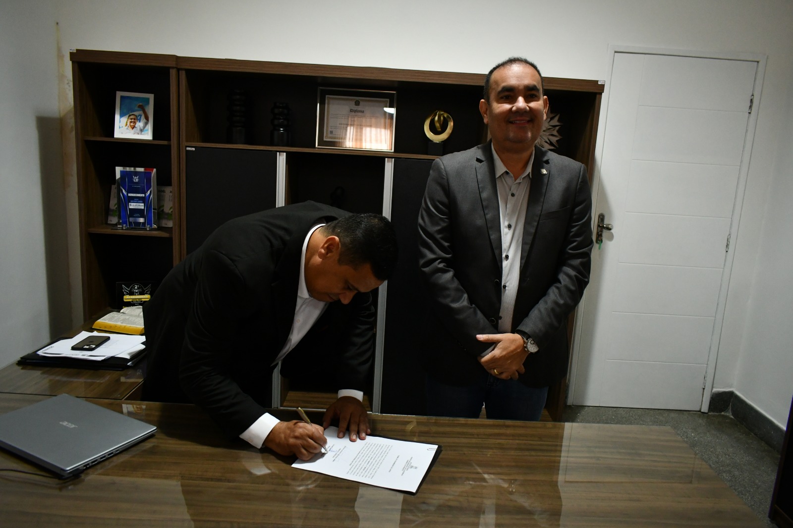Luciano Sérgio reiterou que, do ponto de vista prático, a passagem de cargo continuará sendo parte do processo de gestão conjunta, realizada entre ele e Gustavo Carmo. “Não haverá nenhuma movimentação fora do padrão que Gustavo já estabeleceu na gestão de nossa cidade. Esse ato faz parte da aliança que construímos e regamos todos os dias. A única forma de o nosso projeto continuar dando certo é rompendo divisas, buscando perspectivas internacionais, e é justamente isso que Gustavo fará nesta viagem. Assim, o nosso abraço, nesta manhã, representa a nossa unidade e simboliza nossa união em prol de nossa cidade”, enfatizou o prefeito em exercício.